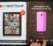 A trio of LEDs, a slab of plexiglass, four batteries and an array of buttons make up an interactive Moto X ad, right in the middle of the magazine. The design enables readers to “customize” a Moto X’s rear, with bright LEDs illuminating the phone in 11 different colors. Tap blue and the phone lights up blue, yellow and it’s yellow, red for red, and so on. The ad shuts off after a few seconds of inactivity, so those four lithium batteries should last you for quite some time, serving as a reminder of Moto’s accomplishment long after the smartphone is laid to rest, while boosting this issue’s appeal for collectors as well.