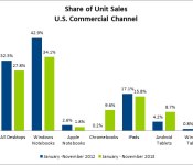 Meanwhile, sales of Chromebooks in the United States grew to 9.6% in 2013, surpassing the 1.8% share of unit sales held by Apple notebooks. Windows notebooks still held on to 34.1% of the market, but was down 8.8% from the 42.9% share it held last year.