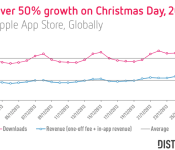 Main contributors to this year’s Christmas spike were Western countries. For example: download volume in the United Kingdom increased by 161 percent on Christmas day. In addition, revenues in United States almost doubled with a plus of 97 percent in the Apple App Store. In the large Asian app markets like Japan and Korea this trend was hardly visible.