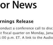 Apple updated its investor relations page today to note that it will announce its earnings for the first fiscal quarter (fourth calendar quarter) of 2014 on Monday, January 27. The earnings release typically occurs just after 4:30 PM Eastern Time following the close of regular stock trading, and the conference call is scheduled to follow at 5:00 PM Eastern / 2:00 PM Pacific.
