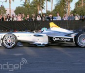 Sure, we’ve already heard about Formula E’s car being tested and detailed as it progresses towards its inaugural season, we haven’t yet had opportunity to get cozy-like. The fledgling race series chose Las Vegas and CES 2014 to give the public its first proper demo and peek at the car and we simply couldn’t miss the chance. As a primer, if you’ve missed the other announcements, the SRT_01E is an all-electric car producing 200kW — that’s roughly 270 HP — with the motor, gearbox and electrics designed by McLaren, batteries and management systems by Williams, tires by Michelin, monocoque chassis by Dallara and all integrated by Renault.