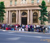 Customers started waiting in line almost 15 hours before the store was schedule to open its doors at 10 AM local time, with many hoping to score one of the limited edition Brisbane store T-shirts that were handed out. The dedicated fans were allowed in by exuberant store employees who greeted them with high-fives and cheers. Store leader Jonny Walker told PerthNow that he is proud of what Apple has done with the historic site.