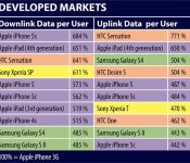 Users of the latest iPhone 5s consume more downlink data than any other smartphone users in both markets under study, consuming almost seven times and twenty times as much as the benchmark iPhone 3G users. This is consistent with the trend seen over the past three years where users of the flagship iPhone devices were the most data-hungry smartphone users. As in past years, we are not in a position to directly identify the root causes of this data consumption.