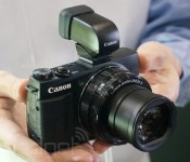 We caught up with the Mark II at the annual CP+ trade show in Yokohama, Japan, and while we weren’t entirely convinced of the camera’s practicality based on press photos and a spec sheet, a few minutes of shooting helped seal the deal. This G1 X refresh was comfortable to use and very responsive, from the speedy zoom toggle to the super-fast focusing. The LCD was quite sharp and bright, and while we missed having an optical viewfinder to play with, the boosted functionality in other departments made the tradeoff worthwhile. (Canon’s also planning to offer an external electronic viewfinder — pictured above — which seems like a reasonable compromise.) We did struggle with focusing in macro mode, just as we did with the original X, but the lens performed quite nicely with subjects a bit more in the distance, so if you’re not planning to shoot close-ups of flowers, you should be fine. Video shooters beware: while there is support for 1080/30p captures, there’s no microphone input or headphone jack.
