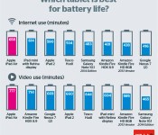With the Internet (web browsing) test, the iPad Air saw 658 minutes of battery life, or nearly 11 hours. The Retina iPad mini came in second place with 614 minutes of battery life, while the Samsung Galaxy Note 10.1 and the Amazon Kindle Fire HDX 8.9 lasted just 483 minutes and 481 minutes (eight hours), respectively. Apple’s iPad 2 also performed well, lasting 590 minutes.