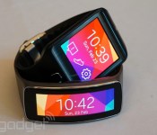 Then there’s the Gear Fit. In this trio of Samsung smartwatch amigos, it’s kind of the oddball, what with its 1.84-inch curved Super AMOLED display (432 x 128) and narrow focus on health and wellness. The Fit, like its Gear siblings, also features a swappable strap, Bluetooth 4.0 and an IP67 rating for water-resistance, except its battery is rated for longer use at up to four days. Of the bunch, it’s definitely the most physically attractive Gear option and the one we could really see users embracing.
