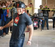 Intern Jackson Sheehan volunteered to be CUPID’s first human victim, and after a quick vitals check by an on-site paramedic, he was cleared for duty. The affair lasted just a hair over five seconds — the device can stun several times in up to 10-second bursts, but the company’s attorneys mandated that Chaotic Moon co-founder William Hurley (@Whurley) manually pull the plug after half that time. Sheehan was clearly subdued by the drone, falling onto safety mats against his will. He stood up shortly after, and was on his way after the paramedic removed the barbed leads from his back. We caught the whole ordeal on camera, of course; the video is embedded for your viewing pleasure just below.