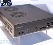 The Intel NUC proves just how small a desktop-class, 4K-capable Haswell PC can go. What the NUC doesn’t do, though, is let us switch out the processor – it comes with either a Core i3 or i5 soldered to the mainboard. Now, Shuttle‘s DS81 is slightly bigger than the NUC, but it’s still tiny (19 x 16.5 x 4.3cm) and its H81 chipset supports user-upgradeable processors up to a Haswell Core i7. Like the DS61 before it, the DS81 comes with serious cooling to let it function in environments up to 50 degrees, such as in digital signage situations. It’s also deceptively big in terms of connectivity, with two PCIe Mini slots (one half-size and one full-size), two slots for RAM (up to 16GB), six USB ports (two of which are 3.0), three displays outputs (1x HDMI and 2x DisplayPort), dual Gigabit Ethernet ports and even a card reader. A Shuttle rep we met at CeBIT told us the DS81 should start to become available from next week, starting at 178 euros ($250) for a barebones unit – although some retailers are already offering pre-built systems for upwards of $800 with a two- or three-week shipping delay.