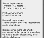 In the image you can see a small change log that outlines the OS update to Android 4.4.2. Along with Cloud Print Service, security enhancements, bug fixes and Bluetooth improvements.