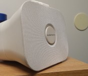 Beginning with the most obvious aspect, this speaker just looks awesome. It’s incredibly simple, and doesn’t try to dazzle anyone with flashy buttons or designs. Its horn shape reminds me of the old speakers that are used in the P.A. systems in high schools. You know, the ones mounted high on the walls of the hallways, that deafen students when the alarm sounds during a fire drill. While this is an obvious design choice, it’s actually done in a very sleek way. The speaker is square, but has rounded, subtle edges. It widens toward the front, giving it that classic look.