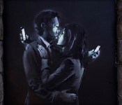 They say that the best art imitates life, and let’s be honest, our lives are increasingly controlled by technology. After tackling war, human rights and censorship, legendary and anonymous street artist Banksy is now turning his critical eye on our digital existence — and not surprisingly his view is bleak. Two pieces, one confirmed and one suspected, from faceless man who uses the streets of urban Earth as his canvas cropped up in the UK this week. The location of the first and confirmed piece has yet to be identified, but photographs of it have appeared on Banksy’s website. It depicts two lovers in an embrace against a darkened doorway. But rather than looking lovingly into each others eyes, the man and woman are glued to their smartphones, the screens casting an inhuman glow over their faces.