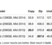Using fewer but larger files, the performance difference narrowed between the two models, but the 2014 11-inch MacBook Air still performed 35 percent slower copying files than the mid–2013 13-inch MacBook Air with the same storage capacity and 53 percent slower when uncompressing files.