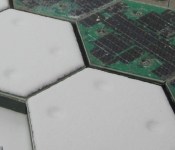 Each interlocking hexagonal segment is covered with toughened and textured glass that’s capable of withstanding 250,000 pounds. Beneath that, you’ve got a solar panel, a series of LED lights and a heating element that’ll keep the ice and snow off the hardware in winter. The lights are used to replace conventional traffic lights, offering constantly updating safety warnings and guide lines that can adapt to traffic conditions on the fly.