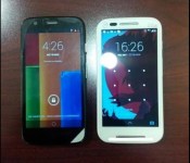 The Moto E is the white device sitting on the right and to the left we see the Moto G. It would appear that the Moto E is forgoing a front facing camera, at least in this particular leaked image. The overall device size is a little smaller as well. Which lines up with the leaked specs that we saw a while back pointing to a 4.3-inch device.