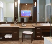 From the bathroom sets, Seura has evolved into building televisions for virtually every room in the house. As people have added more and more technology to their homes, the tech clutter has taken over. Seura’s stylish sets offer a streamlined solution. An off-the-shelf set in the bathroom would take up precious counter space. So Seura sets can be mounted on the wall. In a bedroom, a 100-inch flat screen might make some people giddy, but put a custom frame around it and a mirrored glass in front of it and everybody is happy.