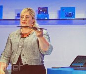 Update: As teased, in the flesh it’s a very thin tablet, with no fans to see. Intel’s president also teased the companion docks, although we only saw a glance of the keyboard add-on. Thankfully, it looked at thick enough to handle a bit of typing.