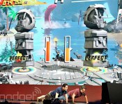 The mini-game is brightly colored and musical, but asynchronous self-competition is just the first step. Hutaeu brought out a colleague, and the two immediately dropped to the floor, kicking off an impromptu push-up competition. On screen, the two presenters are pitted against each other in a Street Fighter-esque arena while the game stacks virtual weights (well, statues and trucks) on their back. It’s hilarious and over the top, but it’s also a good showcase of what developers can do with the new Kinect’s lower latency. Of course, you’ll have to buy Microsoft’s more expensive Xbox One configuration to use it.