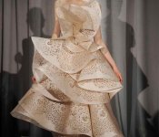 For example, Marc Jacobs used laser cutting to create delicate, ethereal lace and silk pieces for LV’s Spring/Summer 2012 ready-to-wear collection (seen above). Similarly, Georgina Chapman and Keren Craig of Marchesa frequently send exquisite gowns down the runway with the most intricate laser-cut patterns. An example: the soft pink gown with layers and layers of laser cut fabric in Marchesa’s Spring/Summer 2011 ready-to-wear collection.