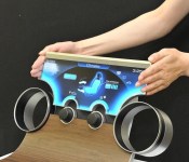 As an example, Sharp demonstrates a prototype display for a vehicle dashboard, with the display conforming to the shape of the main instrument panel, but the company also address the possibility of using the technology for “wearable devices with elliptical displays”.