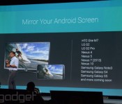 Which is better, huddling around a 5-inch screen or a 50-inch TV? Google is making that answer a lot easier with a few upgrades to its HDMI dongle. Chromecast can mirror your device’s screen to the flat-panel in your living room. The stage demo included using Google Earth and even Android’s video camera app. Even more than that, the HDMI dongle is getting a little more personalized too. What’s more, you know those pretty-looking images that populate your TV screen when you’re using the device? They’re about to get a little more tailored to you. You can customize the images of that ambient feed (seen when idle) with your own personal Google+ photo albums.
