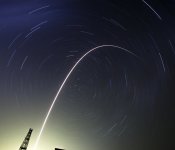 The Soyuz-FG rocket booster and Soyuz TMA-13M space ship are shown here on a long exposure image of the launch from the Baikonur cosmodrome, Kazakhstan. The cargo? Three astronauts headed to the International Space Station. Russian commander Maksim Suraev, American flight engineer Gregory Wiseman, and European astronaut Alexander Gerst will join Steve Swanson and Russians Oleg Artemyev currently aboard the ISS.