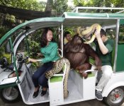 Manny Tangco (far right) owns Manila’s Malabon Zoo. Above he poses with “Pacquiao” the orangutan, an albino python and former beauty queen Gionna Cabrera in a PR stunt last weekend promoting e-trikes in The Philippines. The country’s government is funding an initiative to encourage adoption of electric tricycles over the (estimated 3.5 million) conventional petrol ones. The target is to replace 100,000 combustion engines with e-trikes by 2016. In a statement, Tangco believes many animals are dying because of polluted environment — and one way to prevent this is for a cleaner vehicles such as EVs.