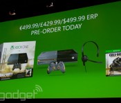Want to get really intimate with the two new Xbox Ones announced at Microsoft’s Gamescom 2014 press conference? Well, unless you’re here in Cologne, you probably can’t get that close quite yet, but we did find said consoles hanging out behind glass. Good news: the white Xbox One completely delivers on its promise. It’s got white plastic! As for the Call of Duty: Advanced Warfare-themed Xbox One, well, it’s absolutely what it promises: Call of Duty symbols are plastered all over the outside. Of course, that COD-themed box also has a 1TB internal hard drive while the white Xbox One is simply bundled with Sunset Overdrive. Neither box was paired with a similarly-themed Kinect, which tells us not to expect a Kinect in the box when both arrive later this year.