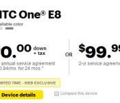 The HTC One E8 with Sprint is available today. As you can see in the image above, there is a limited time web offer that gets you the device for $0 and lets you pay it off in $20.84 installments over the course of 24 months. The other option is $99.99 for a 2-year contract. That is $100 less than the M8 on contract and $6.25 less per bill to buy one.
