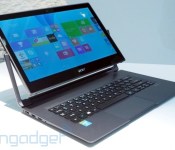 Meanwhile, the Aspire R14 is basically the same “Yoga” design PC makers have been copying all year long: a 360-degree hinge that allows the screen to fold back into tablet mode (and tent mode, and stand mode…). Think we’re being harsh? Even an Acer executive volunteered to us that the design is similar to Lenovo’s line of convertibles. Truth be told, there isn’t much different about the design here, except that the specs run a bigger gamut than what most other brands are offering. You can get it with an Intel Pentium processor, for instance, or you can go all the way up to Core i3, i5 and i7. Some of the higher-end models will also have discrete NVIDIA GeForce 820M graphics, an optional pen digitizer, up to 1TB of storage and up to 12GB of RAM — something you won’t find on a Lenovo machine. It’s expected to go on sale in mid-October, starting at $600 here in the US and €500 in Europe.