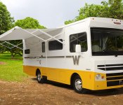 At some point, you’ve likely encountered the iconic stylings of a Winnebago from the 60s and 70s. For the 2015 fleet, the company is looking to pay homage to those motorhomes by bringing back the “eyebrow” on the Brave. In addition to the the classic look of the camper’s exterior, the inside is loaded with tech. There’s a pair HDTVs (28 and 32-inch displays), digital TV antenna system and LED lighting throughout. In the event you find yourself with extra house, er… RV guests, a StudioLoft bunk bed and its powered lift can accommodate, and the vehicle’s GPS/rear-view mirror display slides across the dash so the co-pilot can dial in destinations. If you’re looking to hit the road, you may need to empty that piggy bank as the base model starts at $95,199.