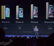 We’re at Apple’s big iPhone 6 shindig, and as you might expect, Apple’s new 4.7-inch and 5.5-inch handsets have rendered its previous handsets a little more… moot. But hey, that means it’s discount time! Apple has lowered the starting price of the 8GB iPhone 5s flagship to $99 on contract, while the 5c runs a cool “zero.” Both devices will also ship with iOS 8 starting September 17th.