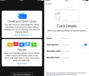 The setup prompt within Passbook is similar to the setup prompt to add passes, educating potential users on what the service is before providing a link to where users can input and scan their credit cards for use. Potential users have the choice to either input their credit card numbers via the keyboard or to take a photo of their card and have it inputted automatically.