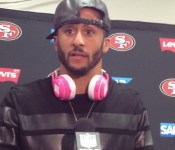 Colin Kaepernick wearing Beats headphones with logo covered. Image via Matt Maiocco