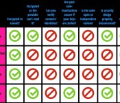 Messaging mainstays like AIM, BlackBerry Messenger, Viber and the once-buzzy trash-talking app Secret brought up the rear with a single point because all they do is encrypt messages as they move from device to service (though the metadata associated with those messages might not be scrambled). Facebook Chat, Whatsapp, Snapchat and Google Hangouts encrypt missives in transit too, but they only gain one additional point because the companies involved audit their code. Comparatively speaking, Apple’s doing pretty well, since the content of your iMessages are shielded from eyes in Cupertino, and because attackers can’t piece together extended conversations from multiples ones you’ve already deleted.