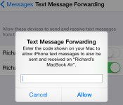 5. Turn on Text Message Forwarding on your iPhone by going to Settings -> Messages -> Text Message Forwarding -> Turn Text Message Forwarding On. A prompt will appear asking you to enter an activation code. The activation code will appear in your Mac’s Messages app. Enter the activation code from your Mac in the prompt shown on your iPhone. An activation code is required for every device that you want to include in text message forwarding.