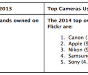 Flickr over the weekend released data detailing the most popular camera rankings of 2014 for the online photo sharing service. With 100 million users uploading 10 billion photos last year, the usual standouts of Canon and Nikon edged out most of the competition, but most interesting was Apple moving past Nikon to take second place in the rankings (via The Next Web).