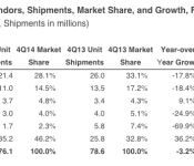The worldwide tablet market continues to be mainly a two-horse race between Apple and Samsung, with smaller competitors such as Lenovo, Asus and Amazon shipping just 3.7 million, 3 million and 1.7 million tablets respectively during the fourth quarter. IDC says that, despite a year-over-year decline, worldwide tablet shipments increased 4.4% to total 229.6 million units in 2014.