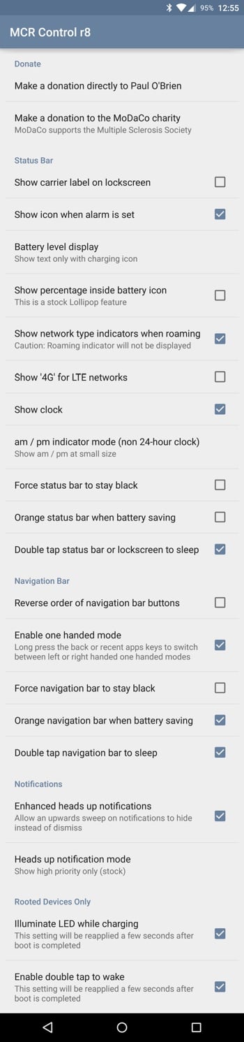 If you’re a big-time modder and you’ve recently purchased the Nexus 6 but like me, are having trouble convincing yourself to switch to a new ROM, have no fear, MoDaCo Custom ROMs has your back with their MCR Modpack. Think of this as a gravitybox lite. If you’re using a rooted stock ROM (they warn against using this of custom ROMs for fear of unknown side-effects) you can just flash this zip in recovery and get a selection of the features you may have been missing out on running stock.