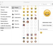 Emoji picker in OS X 10.10.2 (left) with paginated categories vs. OS X 10.10.3 (right) with single scrollable page and category jumps