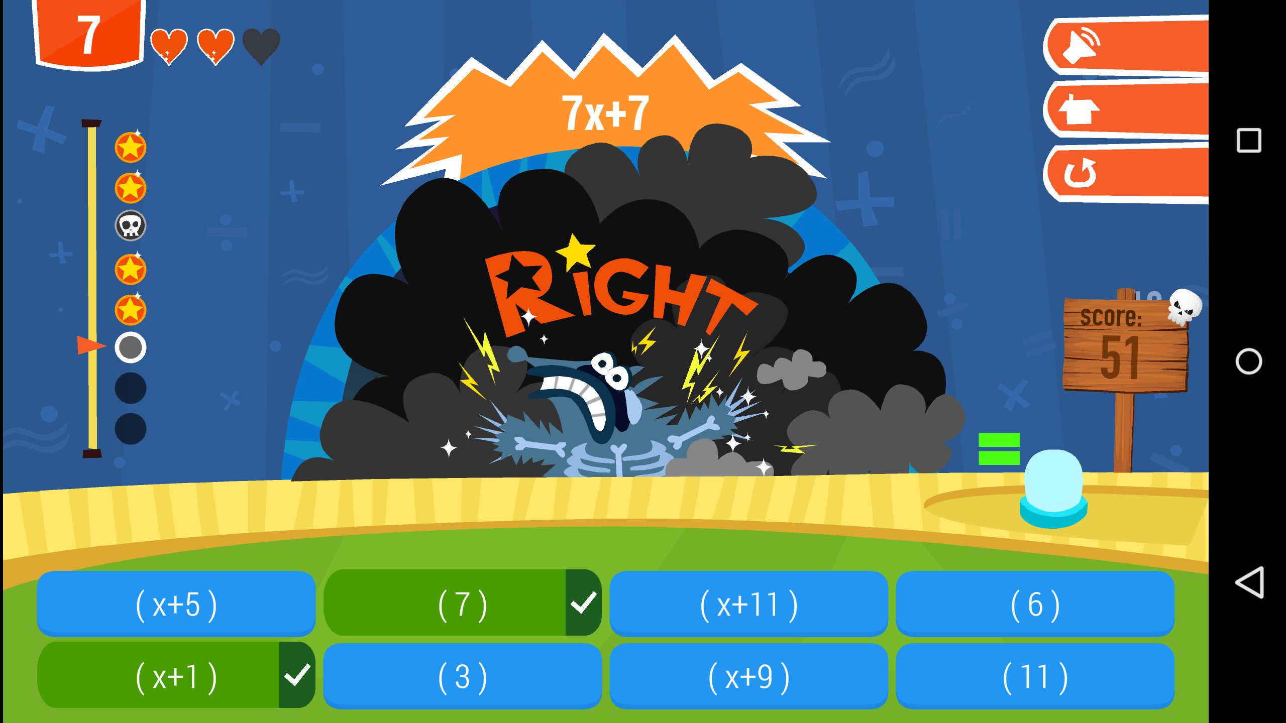 Factor Monsters has ten levels of different monsters that you must defeat by factoring a given equation before time runs out. As the levels progress, the equations become harder and more complex. The instructions are easy to understand and are displayed at the beginning of every game. The visuals of this game are very appealing, and I love the drawn art of the monsters. The gameplay in Factor Monsters is also fun. The problems start out relatively easy, but become quite difficult in the later levels. To solve the problems, you have to choose the factors of a certain binomial or trinomial There are eight questions in each level and three lives, so you can only miss three questions per level.