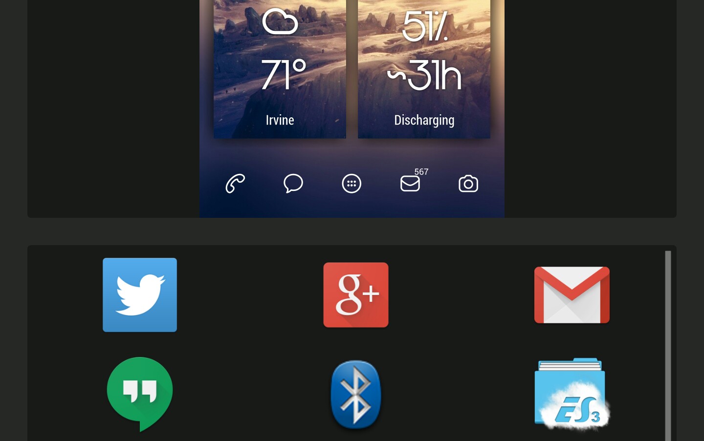 Under this menu, you can customize the look and actions of popular icons like phone, email, and SMS. Tapping on one of the icons brings up a popup window with several options. You can change the label displayed under the icon. You can also link each icon with a specific app so it opens every time the icon is pressed. There is also the option for a swipe up action. This will cause an action to occur when you swipe up from the icon. An good example of this is launching the Contacts app whenever you swipe up from the Phone icon.