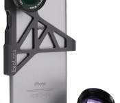 The ExoLens system comprises two lenses — a 3x telephoto lens and a 165º wide angle lens — that screw into a machined aluminum bracket that slides onto an iPhone. The bracket has an integrated 1/4″-20 tripod mount, which will also work with some selfie sticks/monopods. Also included are lens caps, a lens hood for the telephoto lens, and a microfiber carrying pouch. ExoLens officially launches today for the iPhone 6 with a retail price of $129.95, with a model for the iPhone 6 Plus planned for release in May.