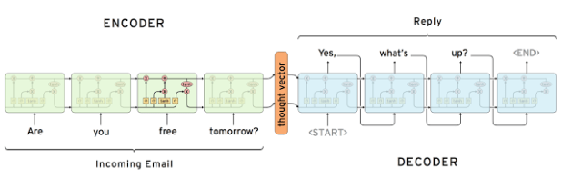 Like other sequence-to-sequence models, the Smart Reply System is built on a pair of recurrent neural networks, one used to encode the incoming email and one to predict possible responses. The encoding network consumes the words of the incoming email one at a time, and produces a vector (a list of numbers). This vector, which Geoff Hinton calls a “thought vector,” captures the gist of what is being said without getting hung up on diction — for example, the vector for “Are you free tomorrow?” should be similar to the vector for “Does tomorrow work for you?” The second network starts from this thought vector and synthesizes a grammatically correct reply one word at a time, like it’s typing it out. Amazingly, the detailed operation of each network is entirely learned, just by training the model to predict likely responses.