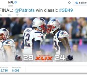 Gridiron football isn’t exactly a world game, but the spectacle of the Super Bowl still draws nearly a billion viewers who do a heckuva lot of tweeting. It just horse-collared its previous Twitter record with around 28.4 million tweets from around the globe, easily surpassing last year’s mark of 24.9 million. This year’s edition did have a lot going for it: a tight match, a crazy finish, all those pricy ads and the whole Katy Perry dancing shark hoedown. But despite all that, it still couldn’t touch the World Cup, which triggered 32.1 million tweets for the finale and 35.6 million for the Germany vs. Brazil semi-final matchup. And most of those likely involved the game, not a gigantic animatronic tiger.